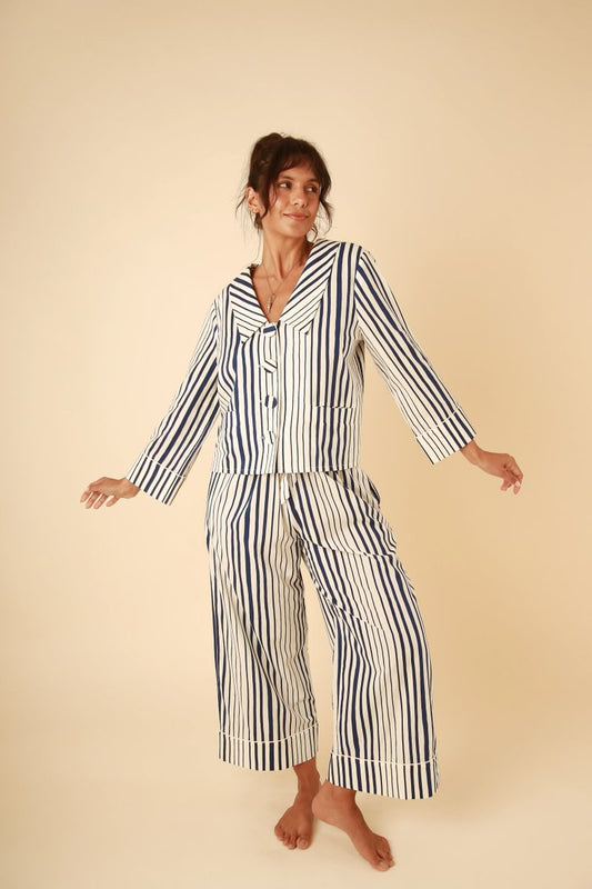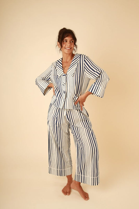 DEMI's jacket-style top with oversized buttons, and culotte length trousers give her a contemporary silhouette with a playful feel. She is crafted from 100% cotton and is comfy enough to sleep in, but statement enough as an outfit in her own right. We dress her up with metallic Annie's Ibiza boots, and will be wearing her all autumn-winter long.