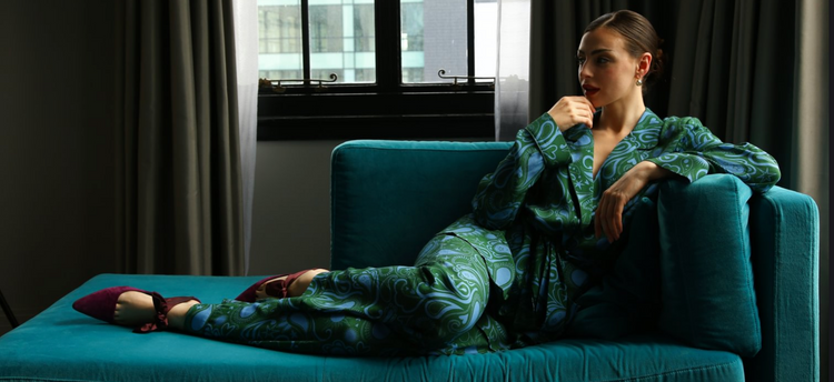 With jewel-tone ruby and emerald palettes, our hand-drawn paisley print is made up of stars and suns, and is truly unique. Simply add sequins and velvets to elevate from loungewear to partywear.