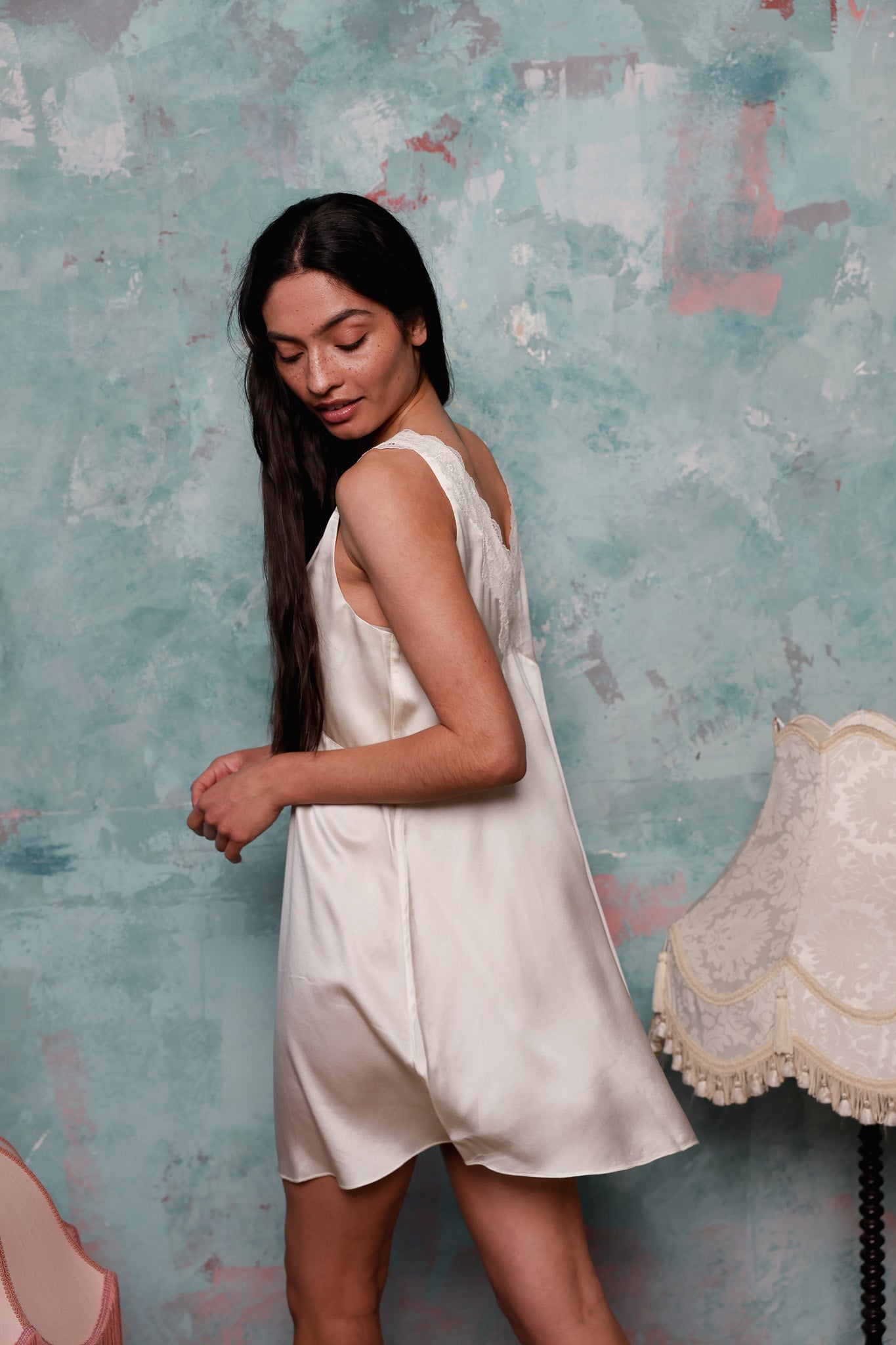 Introducing our 100% silk ALESSIA mini dress. As with all things 9pm, we have taken inspiration from the traditional sleepwear, and elevated this nightie into the perfect bar-to-bed dress for party season. With a lace V-neckline, easy-fit bias cut (no zip or buttons in sight!), generous bust, and a playful mini length – she is an absolute dream to wear.