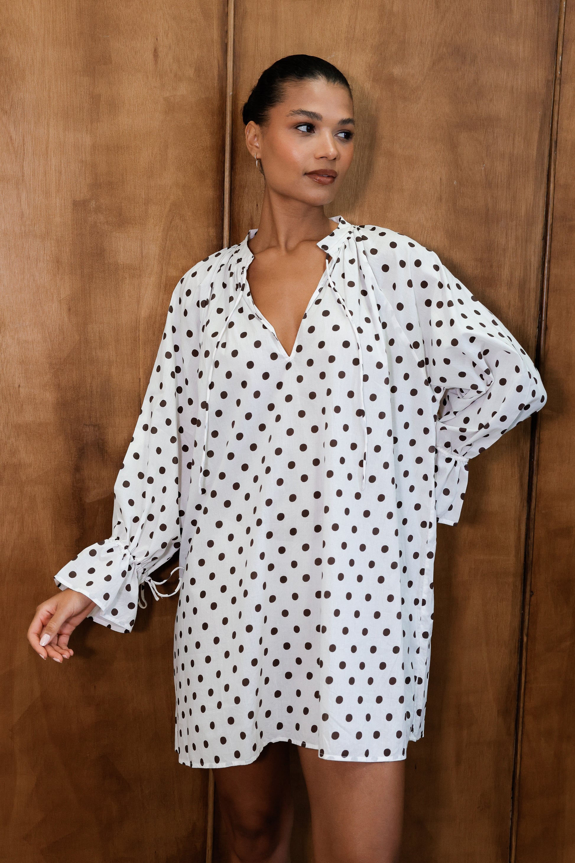 Our Margot dress is the first of its kind for IT'S 9PM. When expanding our range into dresses, we wanted to create styles that are easy enough be worn all day, and all night, all summer long. Our Margot dress is oversized but feminine, with a nod to 60s seaside style. With billowing sleeves, clown cuffs, and a drawstring neck, she looks just as good barefoot on the beach as she does to evening drinks in the old town.