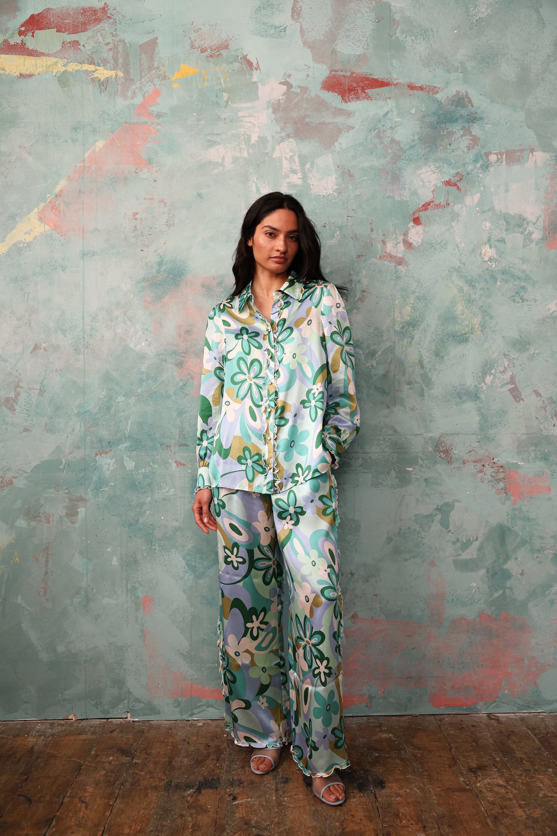 Meet Vogue. Our new hero shape. Crafted from 100% silk, she has a luxurious satin finish, and falls effortlessly across the body. On a traditional pyjama-shape block, we have added lettuce-ruffle trims on the collar, the button placket and the legs of the trouser. She also has mixed-colour crystal buttons, making her a truly special set, designed to be treasured for years to come.