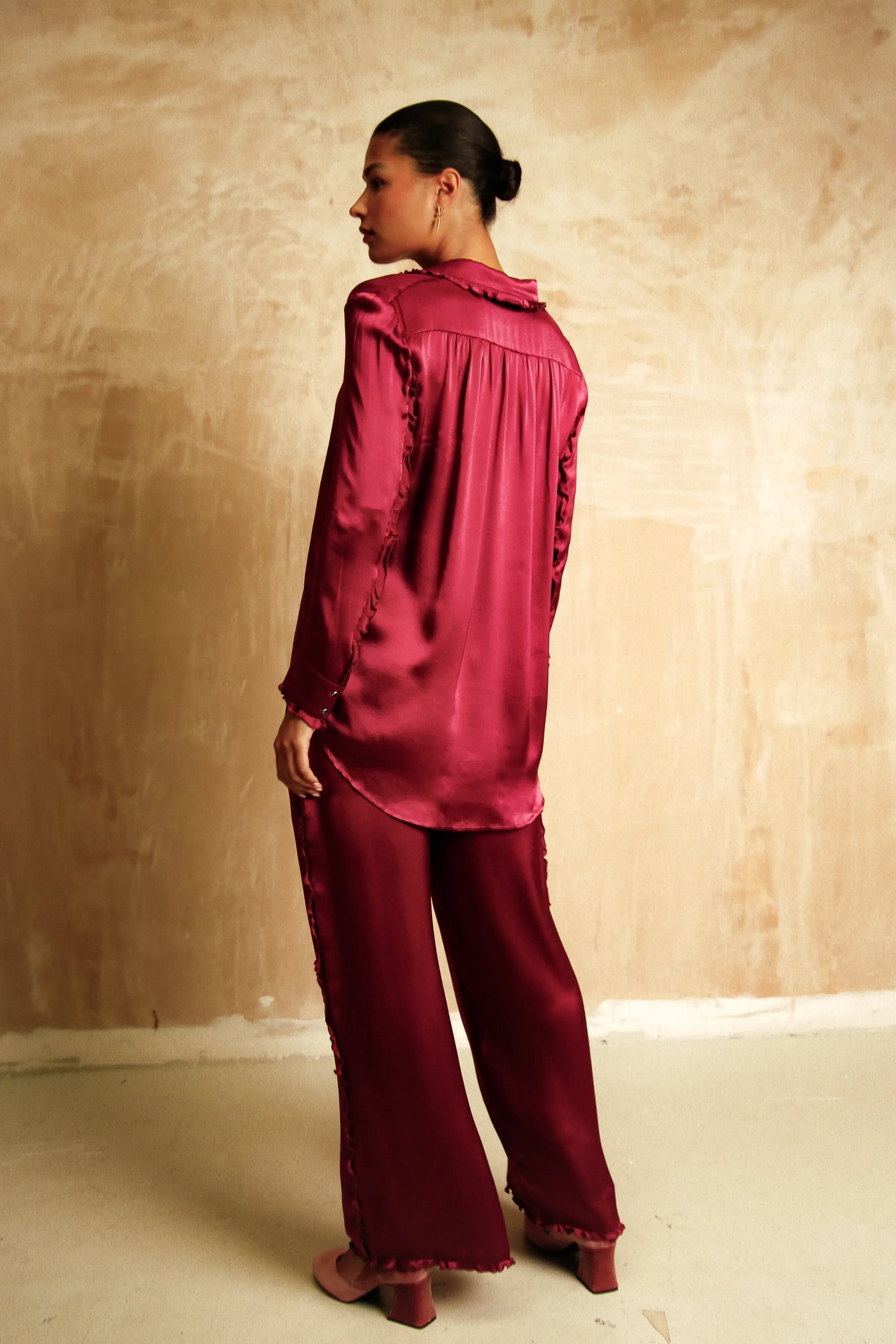 Our ruby silk is fluid in its movement, and is finished with black crystal buttons.